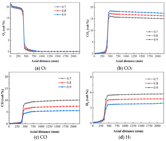 Figure 7 indicates how the concentrations of O2, CO2, CO, and H2 vary for different excess air coefficients on the central axis of the furnace chamber. According to Figure 7a, the simulated values of the O2 volume fractions follow the same trend for different excess air coefficients. The O2 concentration decreases slowly as the primary and secondary air enters the furnace chamber. After the volatile fraction and the coke start to burn, the O2 concentration drops sharply. Under fuel-rich conditions, the O2 is almost completely consumed after the combustion reaction. As Figure 7b,c shows, the CO2 volume fraction rises with an increasing excess air factor, while the CO volume fraction drops as the excess air factor increases. This is because the amount of oxygen entering the furnace chamber grows as the excess air factor increases. Additionally, coal burns better under conditions with a higher air excess coefficient, so more CO2 is produced through complete combustion of the coke with oxygen and less CO is produced by incomplete combustion. Moreover, the amount of residual char present in the reduction zone falls, thereby reducing the amount of CO produced by the reduction reaction. Finally, Figure 7d reveals that the H2 volume fraction drops with increasing excess air. This is due to an increase in the amount of oxygen entering the furnace chamber, resulting in more H2 being consumed in the main combustion zone. Thus, as the amount of oxygen entering the furnace chamber increases, the amount of residual H2 falls and less H2 is produced. At the same time, the amount of residual carbon present in the reduction zone decreases, thereby lowering the amount of H2 produced from the reduction reaction between the residual carbon and H2O in the reduction zone.