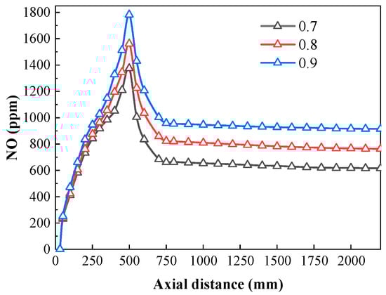 Regarding sulphur–nitrogen interactions, the simulation results for NO with different excess air coefficients are shown in Figure 8. The production rate of NO rises with an increasing excess air coefficient. Compared with the production rate at 0.7, the production rate increases by 24.0% at 0.8 and 48.6% at 0.9. The reason for this is that as the excess air coefficient increases, the amount of oxygen upstream of the furnace rises, and the temperature of the main combustion zone in the furnace climbs. Subsequently, the oxidation rate of NH3, HCN, etc., increases, thereby promoting the production of NO. Downstream from the furnace, an increasing excess air coefficient leads to a drop in the concentration of the reducing gas. Additionally, the rate of the NO reduction reaction decreases, which moderates the reduction of NO.