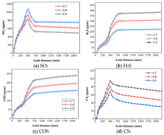 The simulation results for the sulphur fraction with different excess air coefficients considering sulphur–nitrogen interactions are shown in Figure 9. An observation can be made that the production rate of SO2 increased with increasing excess air coefficient, and compared with the production rate at 0.7, the production rate increased by 24.6% at 0.8 and 53.0% at 0.9; the production rates of H2S, COS, and CS2 decreased with an increasing excess air coefficient. The production rate of H2S decreased by 19.3%, COS decreased by 18.7%, and CS2 decreased by 33.3% at an excess air factor of 0.8, while the production rates of H2S, COS, and CS2 decreased by 41.8%, 34.9%, and 56.5%, respectively, at an excess air factor of 0.9. The reasons for such findings were as follows: At higher excess air coefficients, the amount of oxygen upstream of the furnace chamber rises and the temperature in the main combustion zone climbs. Consequently, the oxidation rates of H2S, COS, and CS2 increase, and the oxidation reaction consumes more H2S, COS, and CS2. Downstream from the furnace chamber, increased excess air coefficients lead to a decrease in the concentration of the reducing gas. As a result, the rate of the SO2 reduction reaction decreases, and the amount of H2S and COS generated by the SO2 reduction falls. Moreover, CS2 reacts with H2O downstream from the chamber, leading to a decrease in the CS2 concentration. The above analysis suggests that under fuel-rich conditions, increasing the excess air factor reduces the generation of the corrosive sulphur-containing gases, H2S, COS, and CS2.