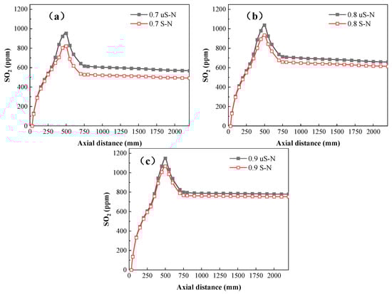 Effects of different excess air coefficients on SO2 concentration on the central axis of the coal combustion chamber for uS–N and S–N: (a) 0.7; (b) 0.8; (c) 0.9.