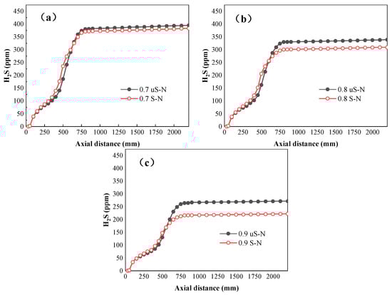 Effect of different excess air coefficients on H2S concentration on the central axis of the coal combustion chamber for uS–N and S–N: (a) 0.7; (b) 0.8; (c) 0.9.