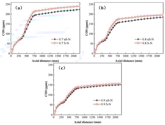Effects of different excess air coefficients on COS concentration on the central axis of the coal combustion chamber for uS–N and S–N: (a) 0.7; (b) 0.8; (c) 0.9.