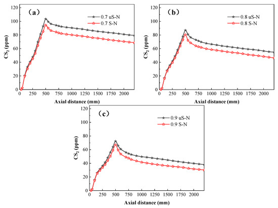 Effects of different excess air coefficients on CS2 concentration on the central axis of the coal combustion chamber for uS–N and S–N: (a) 0.7; (b) 0.8; (c) 0.9.