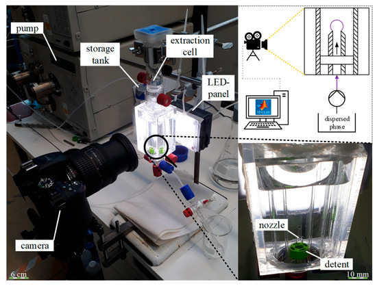 Rising droplet experiments are carried out in an extraction cell (Vint = 17 mL) made of glass which is surrounded by a glass chamber. The inner diameter of the cell is 15 mm. The glass chamber and the heating jacket of the extraction cell were filled with water to reduce optical effects in the videos and images. In total, three glass nozzles with different and initially unknown inner diameters (at the top) were used (determination of the inner diameters made using micro-computed tomography—see Data Availability Statement). Images of the experimental setup and a sketch of the setup are shown in Figure 1.
