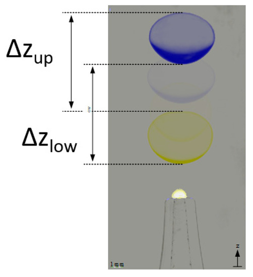 The velocities are calculated based on the pixel differences (Δzup and Δzlow) between image frames, the frame rates (FPS), the measure of length ML and the difference in between the frames Δnframes. The measurements from the top and bottom are averaged to reduce the influence of droplet deformations in between the frames. In combination with the already known inner nozzle diameter, a measure of length ML for the single pixel in the image can be derived.