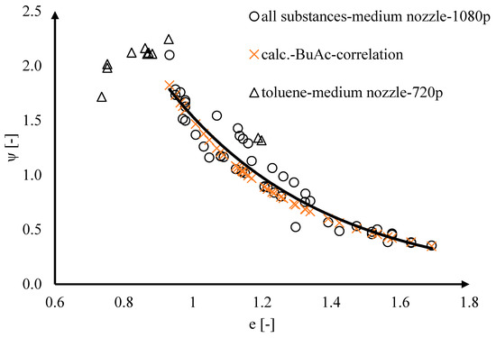 The resulting shape factors are plotted against the aspect ratios (Equation (34) droplet width divided by its height) shown in Figure 9. All investigated liquid systems and nozzles are covered in the graph.