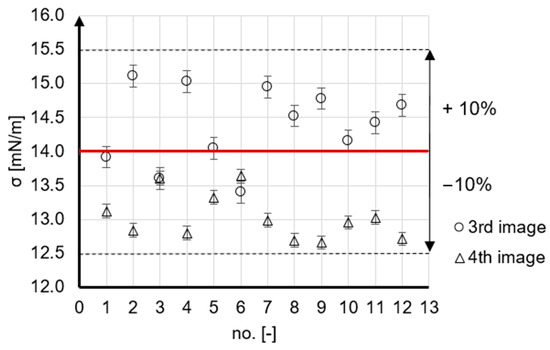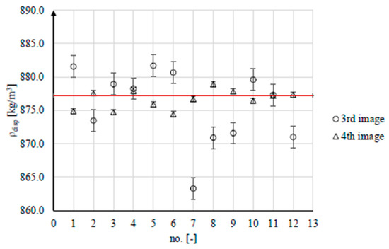 In the graphic, the red line illustrates the density value from the literature. Most of the points lie in a scope of ±5% around the literature value, where the maximum deviation lies in a range from −1.6% to 0.5%. Moreover, the graphic of the results shows that for the fourth image, the fluctuation around the literature value is much less than for the third image.