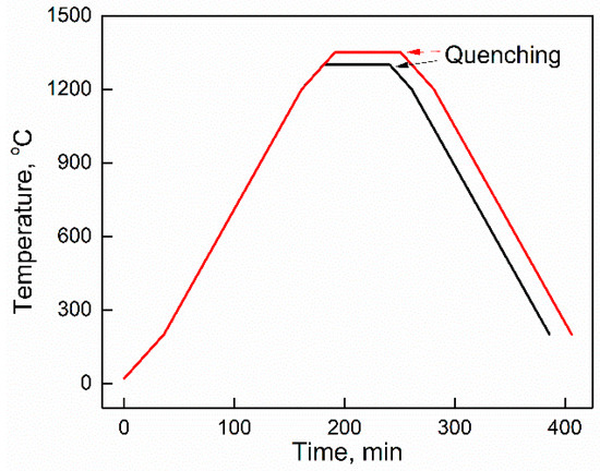 The solid precipitation behavior was experimentally determined using the slag quenching method. The corundum crucible, which was loaded with a 1.0 g sample, was placed in a horizontal tube furnace, and then it was heated to 1300 °C, under specific atmospheric conditions, at a flow rate of 120 mL/min. The temperature program of the quenching experiment is shown in Figure 1. After the sample was kept at 1300 °C (S-A and S-G) or 1350 °C (S-M) for 60 min, it was removed and quenched in ice water. The atmospheres employed in the quenching experiment included MR and air. The corresponding gas composition is shown in Table 3. In addition, a gas mixture (SR) of 97.4 vol.% CO and 2.6 vol.% CO2 was used to simulate the shell gasifier atmosphere. The oxygen partial pressure of SR was close to that of the shell atmosphere. The quenched slag was dried and pulverized to less than 0.075 mm for mineral determination. The solid species of the pulverized slag was determined via X-ray powder diffraction (XRD), using Cu Kα radiation at 40 kV, 40 mA, and λ = 0.154 nm. The step size was 0.02°, and the scanning speed was 4°/min. The microstructure of the quenched slag was determined using a scanning electron microscope equipped with an energy-dispersive X-ray analyzer (SEM-EDX, JSM-7001F).