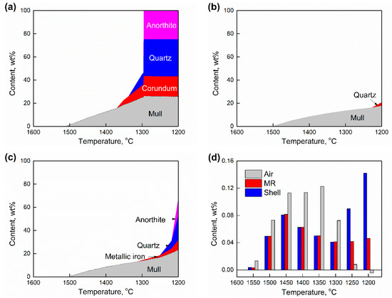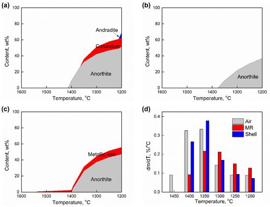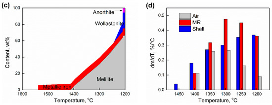Mull is a solid solution of non-stoichiometric mullite with Fe2O3 that was used for the Si-Al-Fe-Ca-O system. As was shown in Figure 9a–c, mull was the primary phase of S-M slag, and its precipitation behavior was almost uninfluenced by the atmosphere. Alex et al. found that mullite was crystallized in low-CaO, low-Fe2O3 slags, and this was consistent with our simulation results. The mull content in air was higher, while the mull contents under MR and shell atmospheres were almost identical. Our results demonstrate that Fe3+ can improve mull crystallization, because the Al3+ in the mull structure can be replaced by Fe3+ [62]. In Figure 9d, the mull precipitation rate in air was relatively higher compared with the other two atmospheres, which was attributed to the high Fe3+ content in air. The crystallization of quartz and anorthite under the shell atmosphere led to a high precipitation rate in mull at temperatures below 1300 °C. Furthermore, the precipitation rate of mull was much lower than that of anorthite and gehlenite.