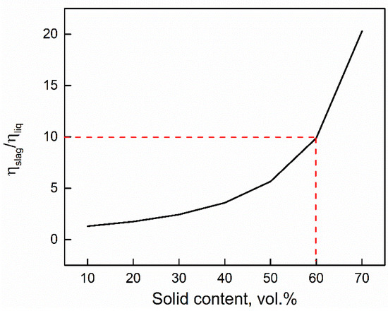 Relationship between the solid content and slag viscosity estimated using the Einstein–Roscoe equation.