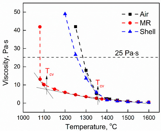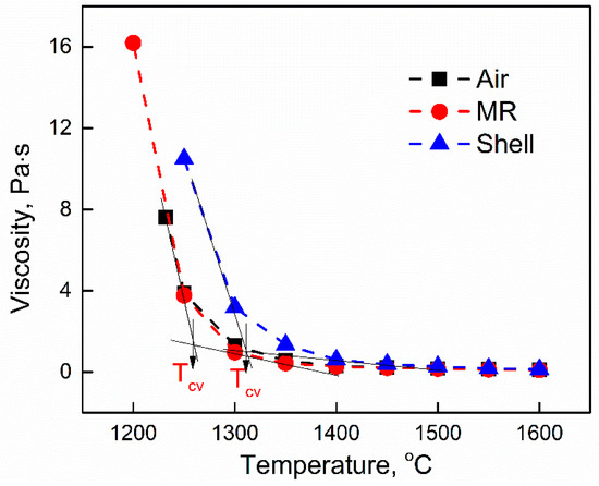 As shown in Figure 8, the low viscosity of S-G slag at temperatures above 1400 °C was attributed to the high content of network modifiers (Ca2+ and Fe2+) in the slag. The gehlenite precipitated below 1400 °C, leading to viscosity differences between different atmospheres. The co-precipitation of gehlenite and metallic iron led to a sharp increase in viscosity under the shell atmosphere. The precipitation behavior of gehlenite in air was close to that under the MR atmosphere, and hence, the viscosity difference was similar under these two atmospheres. Furthermore, the Tcv under the MR atmosphere was the lowest among the three atmospheres. This was attributed to changes in the solid content and the liquid component.