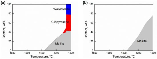 The oxides of coal slag were used as inputs during thermodynamic modeling. The simulation temperature was set from 1000 °C to 1600 °C, with an interval of 50 °C. The simulation pressure was 1 bar. The types of atmosphere employed in this study were air, a mild reducing atmosphere (VCO:VCO2 = 60%:40%, denoted as MR), and a shell atmosphere. The gas composition is listed in Table 3.