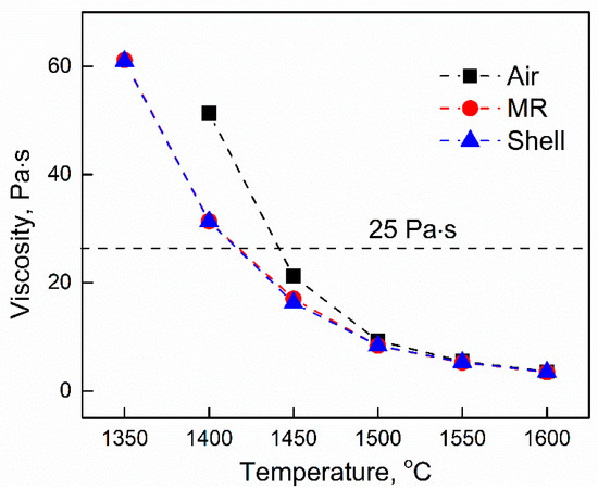 As shown in Figure 10, the viscosity of S-M slag was higher than that of S-A and S-G at 1500 °C because it had a higher content of network formers (Si4+ and Al3+). This viscosity decrease was related to mullite precipitation behavior at low temperature. Fe3+ tended to replace Al3+ in mullite’s structure, improving its crystallization. Hence, the viscosity of S-M slag in air was relatively higher. The increased viscosity in S-M slag caused by the mullite precipitation was masked due to the low mullite content, and the Tcv was barely detectable. Furthermore, the viscosity increase in S-M was mild with decreasing temperature. The slag tapping temperature was assumed to be the T25, at which the slag viscosity is 25 Pa s. The tapping temperature of S-M under the MR and shell atmospheres was 1420 °C, which was lower than that under air. Overall, the viscosity of the slag in the primary phase of mullite was less influenced by iron valence distribution, considering that the Tcv was barely detectable. This was related to the high viscosity of S-M slag, which masked the influence of solid precipitation.