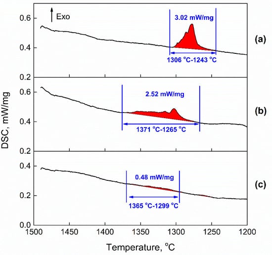 DSC curve of the slags: (a) S-A, (b) S-G, and (c) S-M.