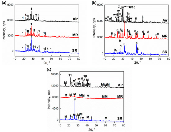 The crystallization behavior of coal slag was investigated via XRD. As shown in Figure 12a, anorthite was crystallized in the S-A slag under the three atmospheres, which was consistent with the thermodynamic modeling results. In addition, metallic iron precipitation was found to occur under the SR atmosphere, while hematite and hercynite were generated in air. Additionally, the diffraction peak intensity of anorthite in the S-A slag at 28° was strongest under the SR atmosphere, which indicated higher anorthite content, as shown in Table 5. As shown in Figure 12b, gehlenite crystallization was identified in the S-G slag. Wollastonite, hedenbergite, and magnetite were crystallized in the S-G slag in air. Furthermore, the gehlenite content was highest under the MR atmosphere because the diffraction peak of gehlenite at 31° was strongest under this atmosphere. This was in accord with the thermodynamic results. Mullite crystallization was identified in the S-M slag. The diffraction intensity of mullite was much weaker than that of anorthite and gehlenite, demonstrating that the crystallization content of mullite was much lower, even at higher temperatures. This was consistent with the DSC results. The diffraction peak of mullite at 16° was strongest in air, indicating high mullite content. Furthermore, the diffraction peak of metallic iron at 44° was highest in the S-G slag, which is in line with the thermodynamic results.