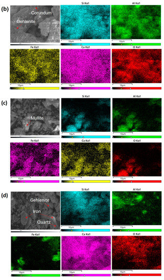 The microstructure of quenched slag was analyzed via SEM-EDS. The phase in the quenched slag was determined based on the element distribution of the EDS mapping results and XRD results. As shown in Figure 13a, Si, Al, Fe, and Ca were uniformly distributed, indicating an abundance of the slag phase. Anorthite crystal was determined to occur in the zone with low Ca content. In Figure 13b, S-G slag shows a uniform element distribution which is similar to that of the S-A slag under MR. Therefore, the high CaO content improved slag formation. In contrast, Si and Al were bonded together in the S-M slag under the MR atmosphere to form mullite, as shown in Figure 13c. Metallic iron and quartz were determined in S-G slag under the SR atmosphere, as shown in Figure 13d. Quartz was bonded with metallic iron, indicating a strong connection between Si and Fe. Magnetite was easily identified in the S-M slag in air, as shown in Figure 13e. Additionally, quartz and mullite were also found.
