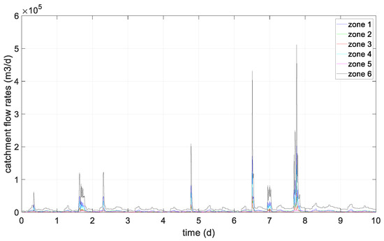Water catchment areas: zones when the water is collected constituting the inlet flow to the sewage that is considered as a disturbance. The resultant flow in each zone are represented by qri, i = 1, …, 6.