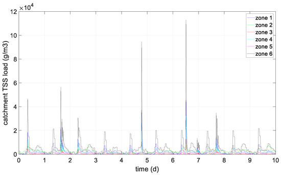 The model describes, in a realistic way, the operation of a sewer network, being excellent for testing different control strategies that optimize the performance of the system. This benchmark simulation model for a sewer system [5] has algorithms to produce different scenarios that include both the features and the volume of urban wastewater and the runoff reaching the sewer network, generated by rainfall of variable duration and intensity, considering the season of the year or day of the week. The generation of wastewater at each catchment area combines several contributions: domestic, industry, stormwater, and infiltration to sewage. The pollutants included are chemical oxygen demand (COD), which can be divided into soluble COD and particulate COD; ammonia (NH4+); nitrate (NO3−); and phosphate (PO43−). Particulate COD is the main component of suspended solids. There are six catchment areas (Figure 1), numbered from 1 to 6.