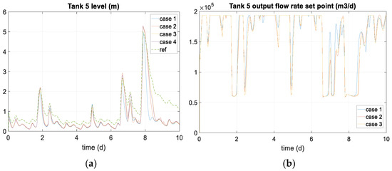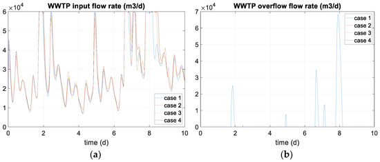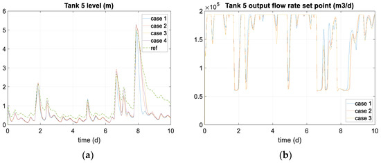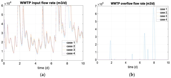 For the MPC algorithm, the horizon N, matrices Q(k) and R, and a terminal penalty for MPC stability, matrix P, obtained from the Riccati equation [51], are tuning parameters. A variable diagonal matrix Q(k) includes all control objectives of 4. When an overflow occurs in a deposit, the associated weight grows to further penalize the difference with the level set-point of this deposit. The elements q11, …, q55, q99, …, q12,12 are the non-zero elements of Q(k) and are calculated by (20), where fi and αi are parameters for tuning MPC. All the rest of the elements are zero because they are related to state variables of pipes and their suspended solids concentrations that do not need to be optimized. To penalize the deviations of the flow set-points in respect to their reference and minimize the operating costs, a diagonal matrix R is used.