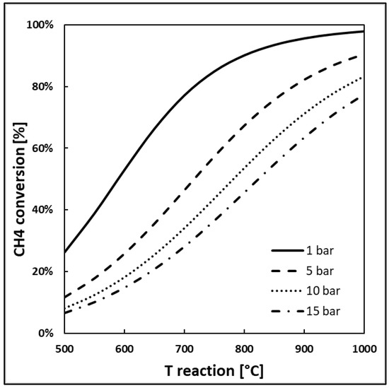 CH4 equilibrium conversion at different temperatures [°C] and pressures [bar] calculated on Aspen Plus v11.