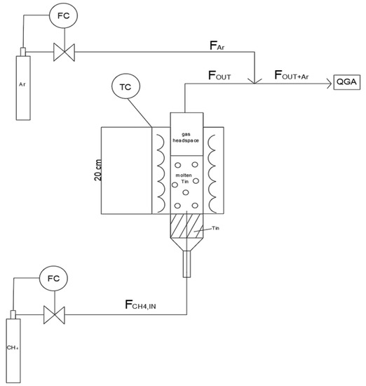 The flow rate of the methane could be varied in a range of 30–140 mL/min. The methane flow rate was controlled by a flowmeter, which was injected into the reactor from a capillary centered at the bottom of the reactor and bubbling inside the molten tin.