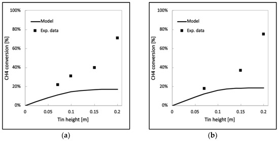 Model and experimental CH4 conversion [%] vs. tin height [m]. (a) Case for 1.5 cm ID reactor. (b) Case for 3.3 cm ID reactor.