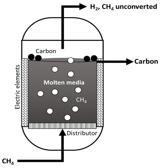 A possible solution is to carry out the reaction in a molten media, such as in liquid bubble column reactors [11,12]. The feed gas is then injected at the bottom of the reactor, which rises as bubbles through the molten metal. In this way, the carbon can be easily separated in continuous operation since the low-density solid carbon floats on the surface of the liquid, preventing carbon accumulation and the blockage of the reactor [2,12,13]. This solution still represents a challenge regarding its applicability on an industrial scale [14].