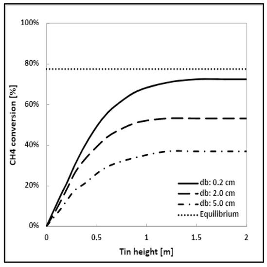 In Figure 7, the methane conversion profile vs. the tin height is reported for each bubble diameter. Figure 7 shows the equilibrium conversion as well, evaluated in the same operating conditions. In addition, in this case, the conversion presents the same trend as shown in Figure 4 and Figure 5; what changes is the value at which the curve flattens out and the corresponding tin height. The latter is independent of the diameter of the bubble and is equal to 1.5 m in all cases. Instead, the methane conversion, as expected and also reported in the literature [6,26], is strongly influenced by the bubble diameter: with big bubbles, a maximum methane conversion of about 37% is obtained; this value can become double only by decreasing the diameter of the bubbles and keeping all other operating conditions equal. This demonstrates that the bubble diameter is one of the key factors for this process architecture.