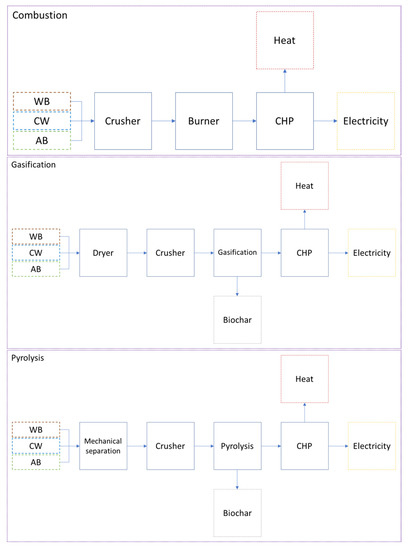 This work provides a case study of a potential biomass thermochemical treatment unit constructed in Greece, implementing combustion, gasification, or pyrolysis. The study took into account the mass and energy balances of the different processes considering the biomass characteristics. Equipment cost (Cp) and bioenergy efficiency were estimated for each process in order to assess the business plans during the lifetime of the investment. This analysis could be a guide for decision−making for biomass treatment in coastal regions of Europe since the subsidy percentage used is common throughout the EU [21]. Moreover, the present study investigates the energy production from a waste stream (algal biomass) that is not commonly used for energy recovery and constitutes a typical biomass solid effluent in coastal regions. The aim of this paper is to offer readers a general perspective of thermochemical processes and to evaluate the energy potential of construction and algal biomass (AB), considering their economic feasibility.