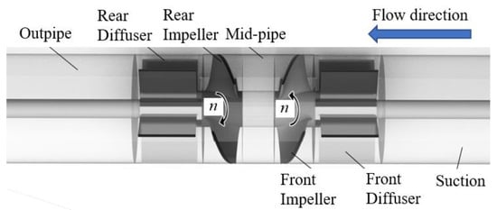 In recent years, many scholars have conducted research on the counter-rotating unit. Cao et al. studied the influence of blade geometry and load distribution on cavitation characteristics [6]. Clarke et al. developed a new type of counter-rotating tidal turbine, whose novelty includes two counter-rotating rotor blade groups that directly drive an open ocean permanent magnet generator [7]. Muis et al. compared the performance of a single rotor and two opposing rotating rotor turbines and found that both turbines can operate with relatively high efficiency [8]. Shigemitsu et al. conducted experiments and performed a numerical analysis to study the performance of small water turbines and found that their efficiency was very high, and they can maintain high efficiency within a wide flow range, while the performance of the secondary rotor is lower under partial flow [9]. Huang et al. studied the vorticity distribution of oblique-flow jet propulsion pumps under three operating conditions and found that the development of cavitation enhances the generation of vortices and the instability of flow within the propulsion pump [10]. Guo et al. applied an improved Zwart cavitation model to study the tip leakage vortex cavitation of a water jet propulsion pump, revealing the tip leakage flow and tip leakage vortex cavitation characteristics under different cavitation conditions [11]. Kan et al. used the entropy production method to analyze the high energy loss regions within key components in an axial-flow pump and investigate the variation in energy loss during the transition process of a bidirectional axial-flow pump [12].
