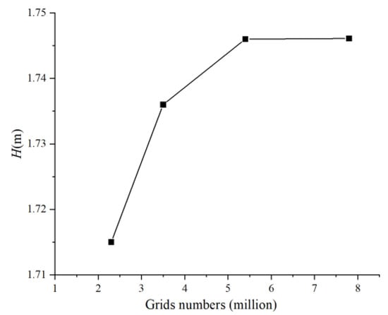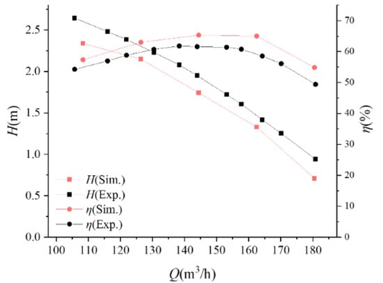 Figure 7 is the performance curve of the two-way pump–turbines by experiment and numerical calculation in pump mode. As shown in Figure 7, there is a slight difference between experimental results and numerical calculation results. This is because the numerical simulation calculation did not consider the mechanical loss. Meanwhile, the experimental pump in this article is consistent with Reference [20], and the difference between the two is not significant under full flow conditions. Accordingly, the numerical calculation results are comparatively reliable.