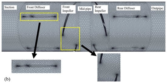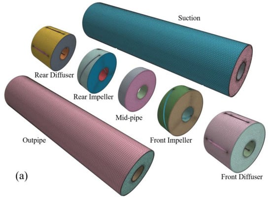 Figure 4 shows the domain of the hydraulic components of the two-way pump–turbine. It should be noted that the rotation axis of the two-stage impeller is collinear, but there are different rotation directions.