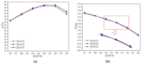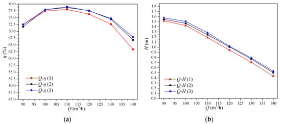 Performance curves of different blade outlet angles. (a) The Q-η curve of different blade outlet angles; (b) the Q-H curve of different blade outlet angles.