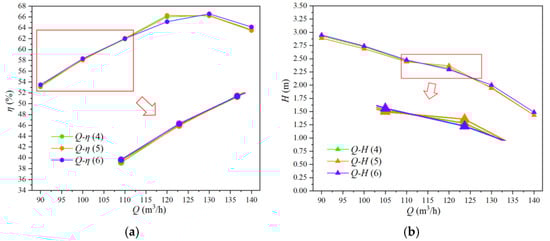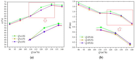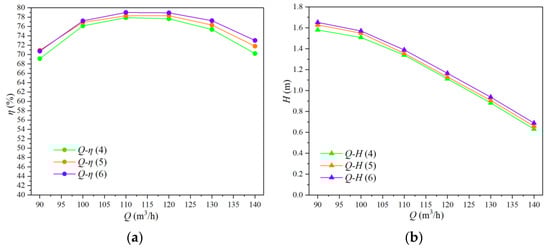 Figure 9 displays the performance curves of various blade outlet angles. Specifically, Figure 9a shows the Q-η curve, while Figure 9b shows the Q-H curve. As shown in Figure 9a, the efficiency point of Scheme 6 is biased toward high-flow operating conditions, while the efficiency trend of Scheme 4 and Scheme 5 is similar. In Figure 9b, there is no significant difference in head changes between different outlet angles.