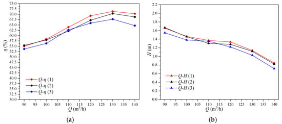 Performance curves of different blade inlet angles. (a) The Q-η curve of different blade inlet angles; (b) the Q-H curve of different blade inlet angles.