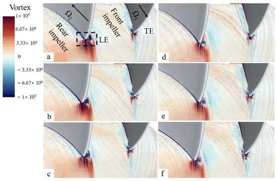 The vortex characteristics of the impeller under different blade angles were studied. Figure 16 is the vorticity of different schemes on Span 1 of the two-way impeller. In Figure 16a–c, a significant difference is not observed in the contours of vorticity around the impeller, which means that the change in the inlet blade angle of blades mainly affects the vorticity caused by blade tip leakage. As shown in Figure 16e,f, as the blade outlet angle decreases, the vorticity region on the PS of the front impeller decreases significantly, and the vorticity area near the LE of the rear impeller also decreases significantly. This is due to the position of the LE impact water of the rear impeller changing.