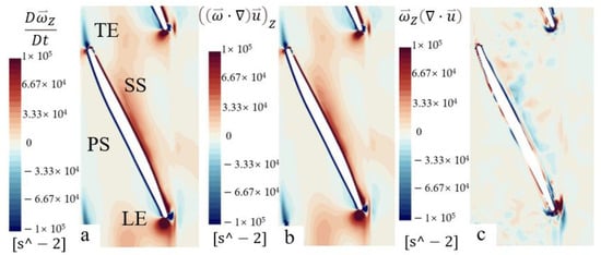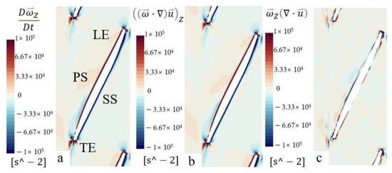 Figure 17 and Figure 18 show each term of the vorticity equation on Span 1 of the front impeller and rear impeller in Scheme 4. Comparing the figures in Figure 17, the vorticity in this area is mainly dominated by the vortex stretching term, which means that the vortex deformation here is relatively severe. In addition, there is also significant vorticity in LE, which is generated by LE impact water of the impeller. There is a region with a small value of vorticity near PS in LE, which is a continuation of the vortex caused by impact downstream and gradually dissipates in the flow. Comparing Figure 17a,b, there is only a slight difference near the blade. The contours of the vorticity caused by the vortex stretching term are mainly located near the blade surface and in the wake near the TE of the front impeller.