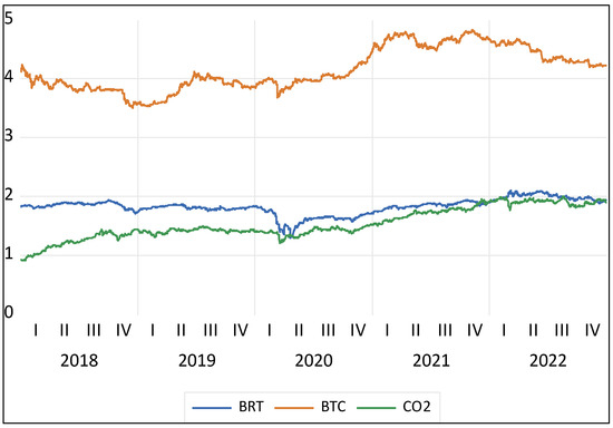 BRT, BTC, and CO2 fluctuation (1 January 2018 to 31 December 2022).