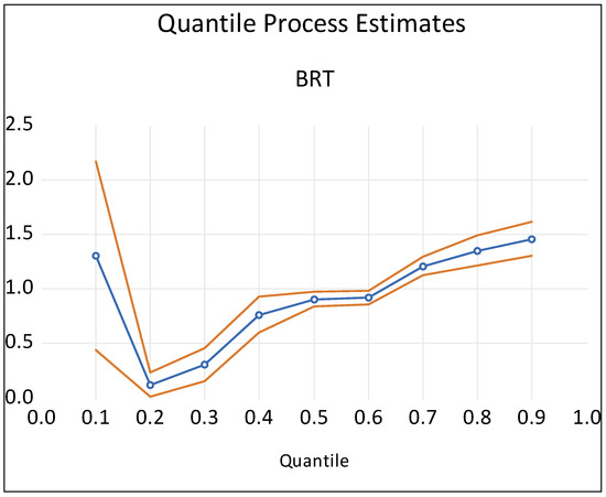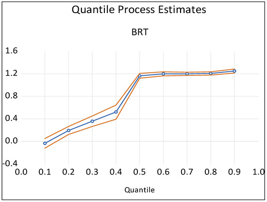 Table 6 lists the outcomes of causality tests for BRT, BTC, and CO2. For Equations (10) and (11), we find the following results. Traditional OLS and quantile regression across different CO2 emission distributions provides evidence of a causal relationship between BRT and CO2. Through quantile regression, a direct correlation is found between BRT and CO2 emissions, except at the 10th percentile of CO2 emission distribution. The results indicate that the influence of BRT on CO2 emissions differs across the quantiles of distribution, with a more significant effect at the upper quantiles (see Table 6 and Figure 2).