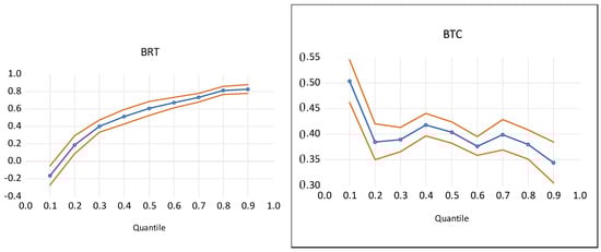 The x-axis indicates BTC quantiles and the y-axis indicates BRT coefficient values. The orange line indicates estimated 95% confidence interval for quantiles.