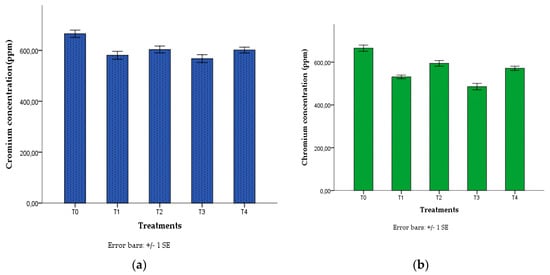 Figure 1b shows the mean total chromium on day twelve of measurement. The lowest values of total chromium achieved for each treatment were the following: treatment 3 (486 mg/mL), Treatment 1 (531 mg/mL), Treatment 4 (571 mg/mL), and Treatment 2 (594 mg/mL). There was a significant difference in all the values of the means of the total chromium in all the treatments concerning the control (665 mg/mL) on day 12 (p > 0.05). On the other hand, Tukey’s statistical test showed four subsets: subset 1 (Treatments 1 and 3; p = 0.147), subset 2 (Treatments 1 and 4; p = 0.220), subset 3 (Treatments 2 and 4: p = 0.691) and subset 4 (control group, T0).