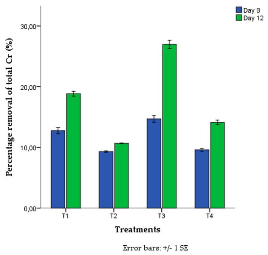 As shown in Figure 2, the percentages of the total chromium removal in the tannery effluents reached on day 8 (blue bars) were 14.70% (T3), 12.74% (T1), 9.60% (T4), and 9.32% (T2). Treatment 3 (1% molasses, 10% Trichoderma inoculum, and pH 4.0) was the one that was most effective at removing the total chromium. All the removal percentages were statistically different from the control (p ≤ 0.05); however, only Treatments 2 and 4 were statistically equal (p = 0.976). In the same way, on day twelve of the evaluation (green bars), the highest value of total chromium removal was 26.97%, corresponding to Treatment 3. Likewise, all the treatments were statistically different concerning the control (p ≤ 0.05). Tukey’s test showed four subsets of treatment with statistical differences between them (p = 1.000). Treatments 1, 4, and 2 achieved removal values of 18.85%, 14.11%, and 10.67%, respectively.