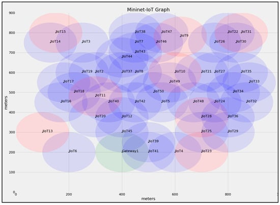 The IIoT platform’s security software should be assessed in context with the restricted computational, storage, and power resources available. As a result, AGSK employs the SECG/NIST-recommended Secp192r1 implementation of ECDH for secret key sharing []. The AGSK experiment and baseline protocols were implemented using a Mininet-IoT emulation environment []. Figure 4 illustrates an example of 50 IIoT devices in the mesh topology that were used to implement and evaluate the AGSK and baseline protocols. The key size that was used and recommended by Secp192r1 was 24 bytes (192 bits) and the maximum packet size was 127 bytes. A connection association was established between the IIoT device and the gateway using the 6LowPAN protocol (40 bytes of header data) []. The configuration and emulation parameters are listed in Table 2. Using the Mininet-IoT, two wireless models were installed to build a 6LowPAN protocol, which included 802.15.4 hwsim and 802.11 hwsim. The topology of emulation was chosen to be a grid with two dimensions 1000 × 900 m, and 5–50 IIoT devices were randomly distributed in the topology for each experiment. To examine the effectiveness of the AGSK, the running time of every experiment was set to 1000 s.