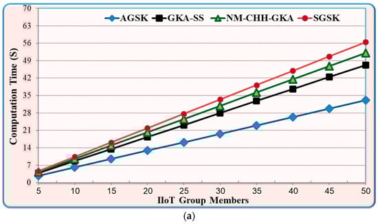 The performance evaluation of the AGSK has been evaluated and compared to the baseline mechanisms in terms of CPU computation time, power consumption, and storage costs. Three baseline mechanisms were inspected which are the SGSK [], GKA-SS [], and NM-CHH-GKA []. All experiments investigated only the performance of the group key sharing without authentication and digital signature for the AGSK and baseline mechanisms. The source code for the Mininet-IoT emulator was written entirely in Python. Each testbed was repeated 10 times, while 1000 packets were exchanged between each testbed, and numerous scenarios were simulated. Finally, the confidence interval based on the average results was 95%, which means the standard deviation error was 5%. Moreover, deterministic cost profiling of the AGSK and the standard procedures was offered in the cProfile and memory profiler applications. The memory profiler application was used to estimate the computation time, memory usage, and power consumption. The number of steps per computation (s/e) and the CPU computation time for each step were multiplied to estimate the total cost of the CPU computation time. Moreover, the storage cost for each IIoT device was determined using the entire cost of the communication (packets sent or received), sensed data, and the implementation cost for each time unit. Moreover, the total energy used by each packet overhead required to run the source code was included in the predicted overall energy usage (mJ) for the IoT devices.