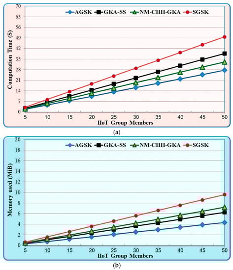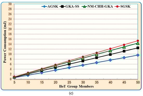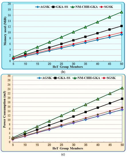 The results that are shown in Figure 5 demonstrate the performance advantage of the AGSK mechanism, which is primarily attained due to the following reasons: Firstly, AGSK uses two steps of incest, which are the public key of the IIoT device to the gateway unicast and the PGP gateway unicast to each IIoT device. In contrast, GKA-SS and NM-CHH-GKA used four steps of sending, which are three steps of broadcasting the public key and the shared key, and one step of the unicast from the gateway to each IIoT device. The reduction in the exchange of shared keys in the proposed AGSK algorithm provided fewer security risks and achieved high QoS performance. Secondly, SGSK used an extremely slow mechanism due to the token ring topology of the group-shared creation. For instance, if the group size is 1000 and each IIoT device needs 0.5 s to process the group shared key, this means that the final group shared key requires 500 s to be created. In contrast, the AGSK used a star topology and simultaneously group shared calculation, which decreased the computation time of the GSK calculation. Finally, GKA-SS and NM-CHH-GKA consumed more resources in terms of memory usage and power consumption. This was mainly due to the three times messages broadcasting between the group members and the gateway. In contrast, AGSK used two steps of unicast messages between the group members and the gateway.