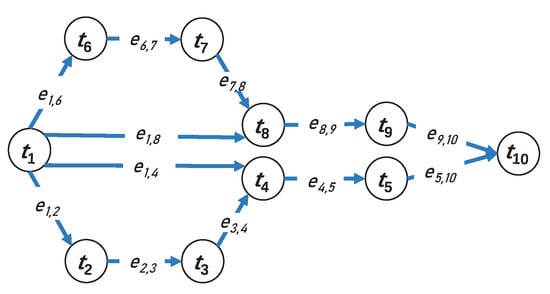 We use workflow to describe the relationship between different tasks of an application. Workflow is an important concept for describing cloud computing and edge computing applications. It consists of multiple interdependent tasks which are bound together through data or functional dependencies. As shown in Figure 2, an application can be built as a workflow, where each task implements certain functionality and collaborates with the others. In Figure 2 the workflow is modelled, as a directed acyclic graph (DAG) . Each vertex represents a task, and the weight vector of vertex is , which represents various resources required by . The adjacency matrix of the DAG is and its elements are defined by (1), where the weights of edges are not considered. The number of edges is denoted as E, i.e., , which equals the number of nonzero elements in . Furthermore, let denote the weight of and it represents the length of communication time from task i to task j. Then, the elements of are updated as .