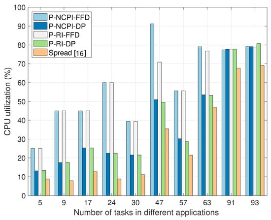 Comparison of the average CPU utilization efficiency of the MEC-based computing network (defined by Equation (24)), when using the proposed four task-containerization-and-container-placement algorithms and the Spread algorithm.