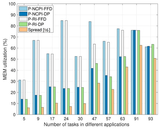 Comparison of the average MEM utilization efficiency of the MEC-based computing network (defined by Equation (25)), when using the proposed four task-containerization-and-container-placement algorithms and the Spread algorithm.