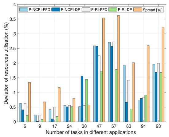 For a given application, the metric defined by Equation (10) can reflect the extent to which different resources are used in a balanced manner. According to Figure 6, in most cases evaluated, our proposed algorithms outperform the Spread algorithm in terms of the balance degree of utilizing multi-type computing resources. Although the DP algorithm is generally inferior to the FFD algorithm in terms of the CPU and MEM utilization efficiencies (as shown by Figure 4 and Figure 5), it performs better than FFD in terms of the balance degree of utilizing multi-type computing resources across the MEC-based computing network. The P-NCPI and P-RI algorithms, which are invoked for the initial task partitioning, do not make much difference in this respect.