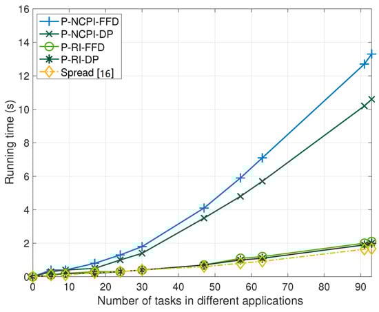 The running time results of all the task-containerization-and-container-placement algorithms considered are provided in Figure 7. It is observed that the running time of the P-RI algorithm is shorter than that of the P-NCPI algorithm. Additionally, when the number of tasks exceeds a particular value, the DP algorithm has a shorter running time than the FFD algorithm. Among the four algorithms we proposed, the P-RI-DP algorithm has the shortest running time, and in this regard, there is very little difference between the P-RI-DP algorithm and the Spread algorithm. Notably, the Spread algorithm always performs best in terms of the running time.